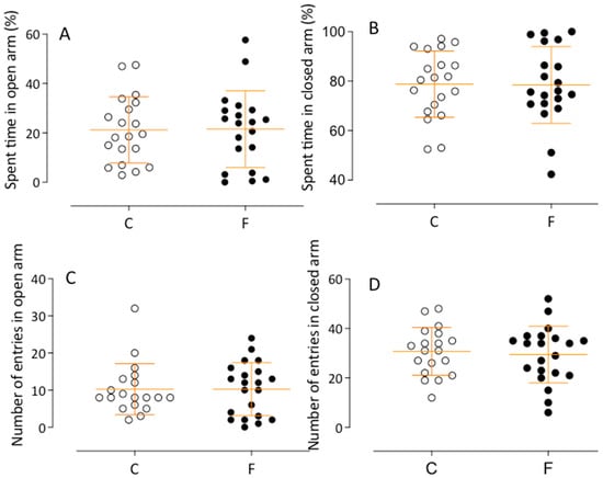 The mean percentage of open and closed arms spent time (A,B) and open and closed arms entries (C,D) for offspring in the elevated plus maze is depicted. The exploration in the elevated plus maze was meticulously measured. No significant difference in the time spent and entries into the open arms between male C and male F offspring were observed. Comparisons involving only two means within or between groups were performed using Student’s t-test. Welch’s t-test was used to correct situations characterized by heteroscedasticity. When statistically significant differences were indicated between selected means, post hoc comparisons were performed using Bonferroni’s contrast test.