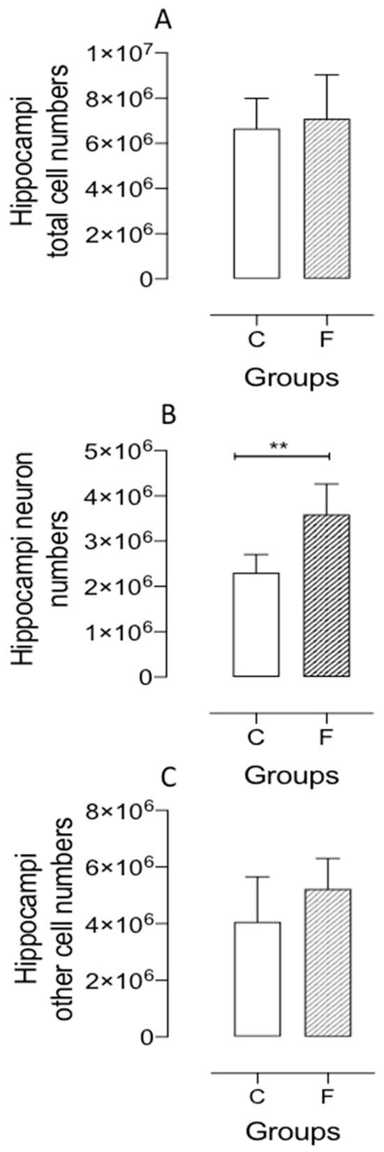 Representative graphics show the hippocampus total cell number (A panel); the number of hippocampal neurons (B panel) and non-neuronal cells (C panel) obtained by the isotropic fractionation technique in the male F offspring compared to the age-matched control male (C) group. Results are expressed as means ± SEM; the significance level was set at ** p < 0.01. Comparisons involving only two means within or between groups were performed using Student’s t-test for each group.