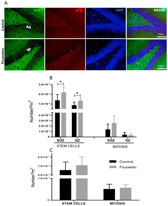 Representative immunohistochemistry: (A) Illustration of the number of mitoses (KI-67), stem cells (Sox-2) (B,C panel), and stem cell mitoses quantified in the subgranular zone (SGZ) and granular cell layer (GCL) of the hippocampal dentate gyrus (GD) in male offspring. On the left side of the panels, the groups of offspring are shown; their mothers were subjected to or not subjected to (control, C) fluoxetine (F) treatment during pregnancy and breastfeeding. Results are expressed as means ± SEM; the significance level was set at * p < 0.05 (one-way ANOVA analysis indicated statistical differences between groups; Bonferroni’s contrast test was performed for post hoc comparisons between means for each group.