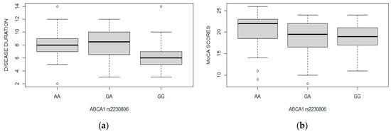 (a) Boxplot illustrates the distribution of individual ABCA1 (rs2230806) genotypes and the duration of the disease; (b) boxplot illustrates the relationship between the distribution of ABCA1 (rs2230806) genotypes and MoCa scores. Whiskers indicate the variability outside the upper and lower quartiles; circles mark outliers.