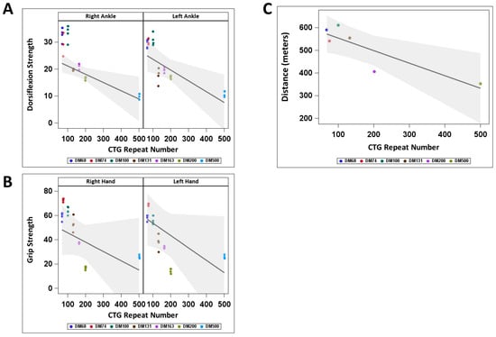 Skeletal muscle function in a group of patients with adult-onset DM1 with increased levels of active GSK3β in PBMCs. Outcomes from the weighted regression analyses of dorsiflexion (A) and grip strength (B) were assessed in relation to CTG repeat number. Each subject’s mean is the dependent variable, weighted by the inverse variance. The 6MWT data (C) are presented without weighting adjustments. Predicted dorsiflexion strength (A), grip strength (B) and distance in 6MWT (C) are shown with 95% confidence bands. Colors show DM1 patients.