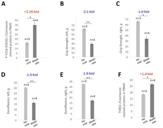 Correlation of the average levels of active GSK3β in blood with the muscle performance of DM1 patients with different severity of muscle disease. (A) Comparison of the average GSK3β levels in PBMCs from adult-onset DM1 patients with 68–100 CTG repeats without myotonia (n = 3) and in patients with 131–500 CTG repeats with myotonia and muscle weakness (n = 4). Western blot data and signal intensity analyses (using Image J2) are shown in Figure 1B,C. A group of DM1 patients with mild muscle disease includes DM1 patients: DM1–68, DM1–74 and DM–100. A group of DM1 patients with moderate muscle weakness includes DM1–131, DM1–163, DM1 > 200 and DM1 ~ 500. The values of grip strength (B,C) and ankle strength (D,E) were compared in adult-onset DM1 patients with mild (n = 3) and moderate (n = 4) skeletal muscle weakness. The skeletal muscle outcomes for each patient with DM1 are shown in Figure 2A,B. (F) Comparison of the blood levels of THBS1 in adult-onset DM1 patients with mild and moderate skeletal muscle disease. Western blot analyses of THBS1 in DM1 blood samples are shown in Figure 1B. Standard deviations and the number of DM1 patients is shown. * and ** are p values < 0.05 and <0.01 for the DM1 patients with mild vs. moderate muscle weakness.