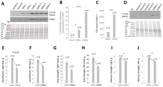 The levels of active GSK3β are increased in PBMCs of patients with juvenile and congenital DM1 correlating with muscle weakness. (A) Western blot analyses of the active GSK3β and THBS1 in PBMCs from the familial control patients (C1 and C2 are a 56-year-old female and a 49-year-old male, respectively), patients with JDM1 (17- and 19-year-old females) and CDM1 (CDM1-1–4 are an 18-year-old female, a 16-year-old male, a 5-year-old female and a 5-month-old female, respectively). Coomassie staining of the PBMC proteins is shown below the Western blot images. (B) The average active GSK3β levels in the PBMCs from control, JDM1 and CDM1 patients were adjusted to the Coomassie-stained proteins shown in the box in (A). * and *** are p values < 0.05 and <0.001 for the average GSK3β signal in JDM1 compared to control and for the average GSK3β in CDM1 patients vs. control. (C) Comparison of the mean length of CTG repeat expansions in JDM1 and CDM1 patients. ** is p value < 0.01 for JDM1 vs. CDM1. (D) Western blot analysis of active GSK3β in pediatric and adolescent control blood samples and CDM1 samples. Coomassie staining is shown on the bottom. The average values of ankle dorsiflexion (E,F), grip strength (G,H) and manual strength (I,J) in patients with JDM1 and CDM1 are shown. The number of patients per group is also shown. * indicates a p value < 0.05 for JDM1 vs. CDM1. While GSK3β levels were evaluated in blood samples from four patients with CDM1, the muscle performance was analyzed in two patients with CDM1 aged 16 and 18. No muscle performance data were collected in two CDM1 patients due to early age (0.5 and 5 years).