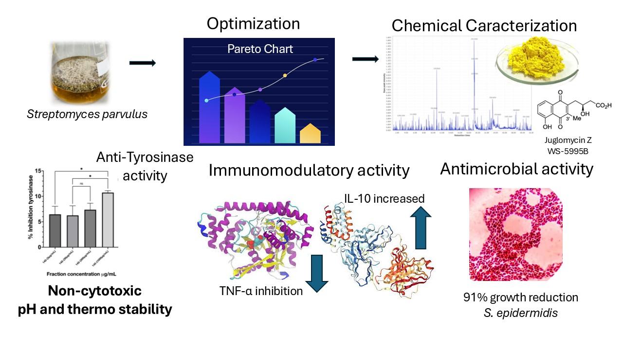 Silva-Arias, L.D.; Díaz, L.; Coy-Barrera, E. Bioproduction Optimization, Characterization, and Bioactivity of Extracellular Pigment Produced by Streptomyces parvulus. Int. J. Mol. Sci. 2025, 26, 10762. https://doi.org/10.3390/ijms262110762