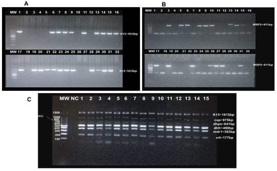 Agarose gel electrophoresis confirmation of P. falciparum active infection and targeted PCR amplification: (A): Screening by kelch13 amplification: Lanes 1, 6, 7, 8, 9, 11, 13, 14, 15, 16, 17, 19, 20, 21, 22, 23, 24, 25, 28, 29, 30, 31 = positive samples, while lanes 2, 3, 4, 5, 10, 12, 18, 26, 27, 32 = negative samples. (B): Screening by msp2 amplification: Lanes 3, 5, 6, 8, 9, 9, 10, 13, 14, 17, 19, 23, 26, 27, 28, 31 = positive samples, while lanes 1, 2, 4, 7, 11, 12, 16, 18, 20, 21, 22, 24, 25, 29, 30, 32 = negative samples. (C): PCR amplification of P. falciparum antimalarial drug-resistance and vaccine gene targets: Bands correspond to kelch13, pfcsp, pfdhps, pfdhfr, pfmdr1 and pfcrt amplicons, respectively. Lane 1–15 = clinical samples. MW = 100 bp DNA ladder; NC = negative control.