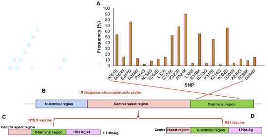 Representation of identified SNPs in the P. falciparum circumsporozoite protein (CSP) vaccine target: (A) Frequency of SNPs identified within amino acid positions 268–361 (x-axis, right to left) corresponding to the C-terminal region of the pfcsp segment in the Pf3D7 reference strain. Structure of the pfcsp protein (B), Structure of the RTS,S vaccine target (C), and Structure of the R21 vaccine target (D).