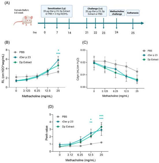 Four-week-old female Balb/c mice were obtained from the National Institute of Health (Bogotá, Colombia), and six mice per cage were assigned to each group of treatment by simple randomization, housed under standard conditions in the animal facilities at the University of Cartagena with a controlled climate (22 +/− 3 °C, 45–55% relative humidity) and exposed to a 12 h/12 h light/darkness cycle. Animals were allowed to acclimatize for two weeks before use, and were fed with standard rodent diet (Ref. 5010, Rodent LabDiet, St. Louis, MO, USA) and drinking water ad libitum. Cage locations and sanitary care were equal for the three groups of treatments. Experiments were in accordance with the recommendations of the European Union regarding animal experimentation (Directive of the European Council 2010/63/EU) []. The research was approved by the Ethics Committee of the University of Cartagena (Protocol code 128, 14 November 2019). The mouse model of allergic airway inflammation was performed using a similar sensitization protocol as in a previous study []. No sample size calculation was performed. A sample size of at least four samples per group were in each experiment. Briefly, six- to eight-week-old female Balb/c mice were sensitized by i.p. injections on days 0, 7, and 14 with 20 µg of rDer p 23 (0.1 UE/µg of protein), D. pteronyssinus extract (0.04 EU/μg of protein), or PBS as a control plus 2 mg of aluminum hydroxide as an adjuvant (Imject® Alum, Cat. 77161, Thermo Fisher Scientific, Waltham, MA, USA), followed by daily i.n. challenges on days 21, 22, and 23 under anesthesia with 100% sevoflurane (Ref. ACRG2L9117, Baxter, Deerfield, IL, USA). On day 24 and day 25, reactivity to methacholine challenge and euthanasia were performed, respectively. Investigators were not blinded in group allocations, except the pathologist in charge of histological analysis.