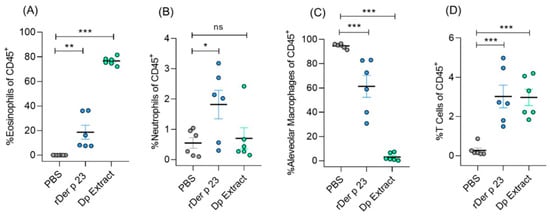 Analysis of immune cell population in bronchoalveolar lavage fluid. Statistical analysis of percentage of eosinophils (A), neutrophils (B), alveolar macrophages (C), and T cells of total CD45+ cells (D) in BALF of PBS-, rDer p 23-, and D. pteronyssinus extract-treated mice. The mean value of each group (n = 6 mice) and the bars representing the SEM of the mean are shown. These results were from two independently replicated experiments. The comparison was performed using the one-way ANOVA test and Dennett’s post hoc analysis. * p < 0.05, ** p < 0.01, *** p < 0.001, ns: not significant.