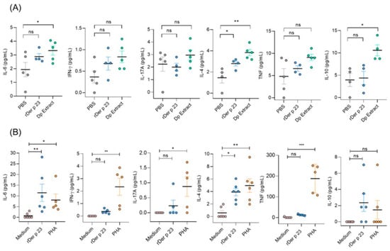 Cytokine profile in mice. (A) Cytokine levels in BALF of PBS-, Der p 23-, and D. pteronyssinus extract-treated mice. (B) Cytokine levels in splenocyte culture of rDer p 23-immunized mice stimulated in vitro with medium, rDer p 23, or PHA. Cytokine levels were determined by Cytometric Bead Array (CBA) and data are reported as individual concentrations (pg/mL). The mean value of each group (n = −4–6 mice) and the bars representing the SEM are shown. The comparison was performed using the one-way ANOVA test and Dunnett’s post hoc analysis. * p < 0.05, ** p < 0.01, *** p < 0.001, ns: not significant.