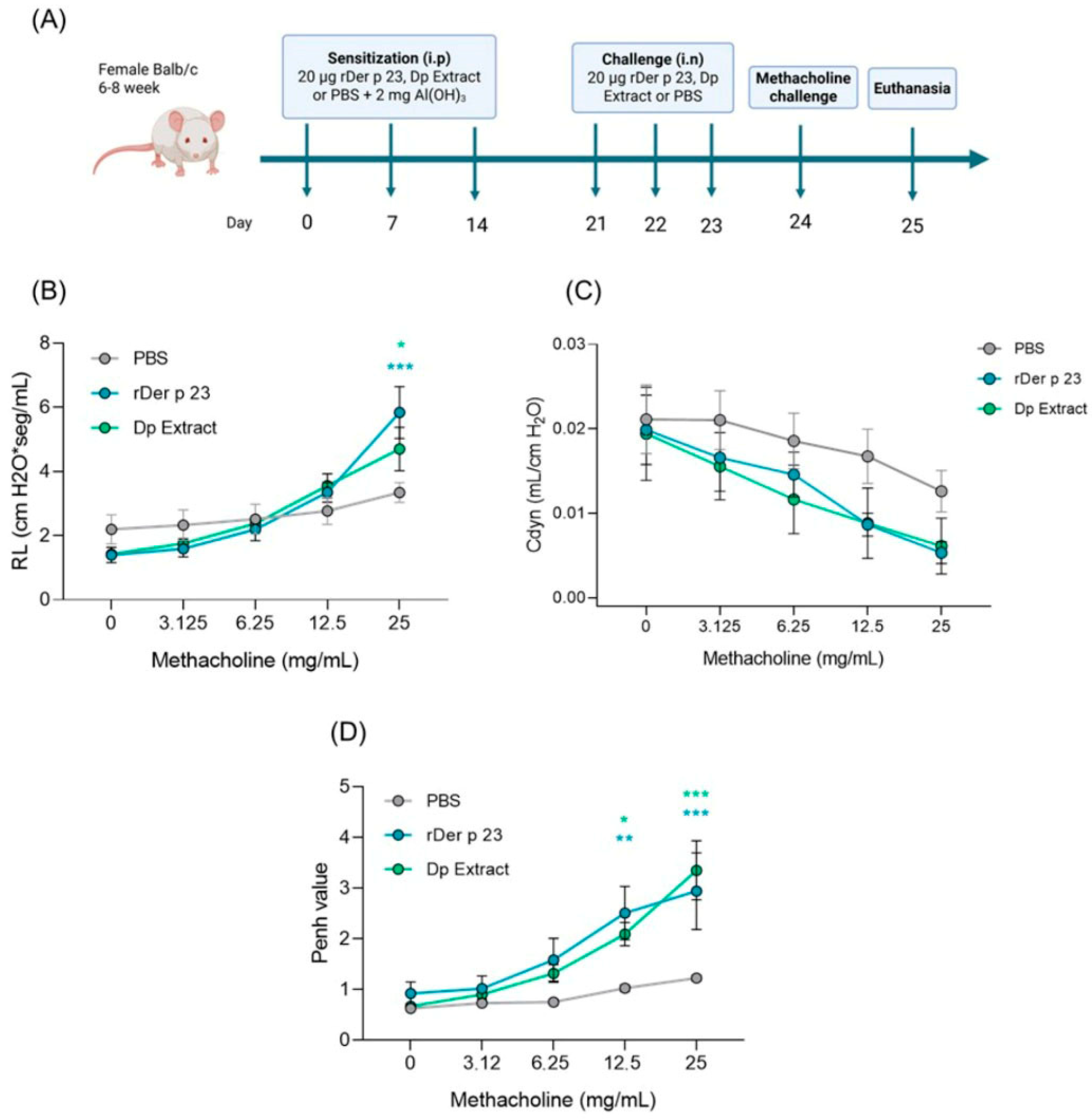 2.2. rDer p 23 Induced High Bronchial Hyperresponsiveness and Airway Resistance in the Mouse Model
