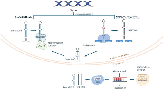 Schematic representation of canonical and non-canonical miRNA biogenesis. Canonical miRNAs are generated from pri-miRNAs processed by the DROSHA–DGCR8 complex, while non-canonical mirtrons arise from spliced introns. Both pathways produce pre-miRNAs that are exported by exportin-5 from nucleus and cleaved by Dicer in cytoplasm, generating mature miRNAs loaded into the RISC complex.
