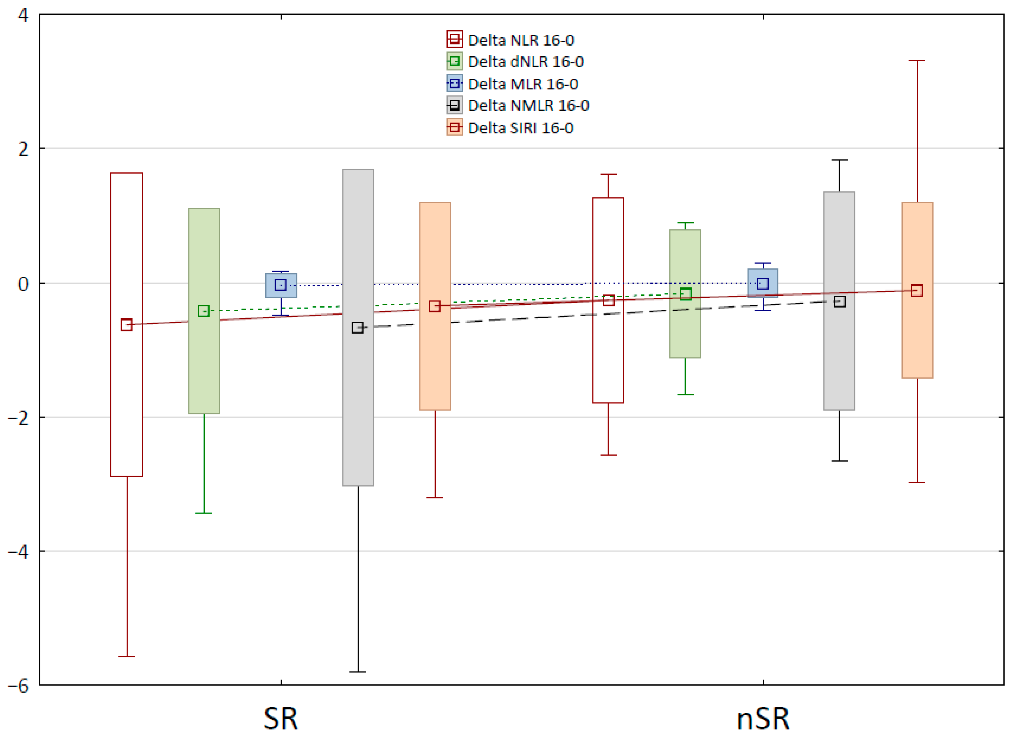 | MLR | monocytes/lymphocytes ratio | −0.04 ± 0.09 | −0.01 ± 0.11 | 0.0213 |