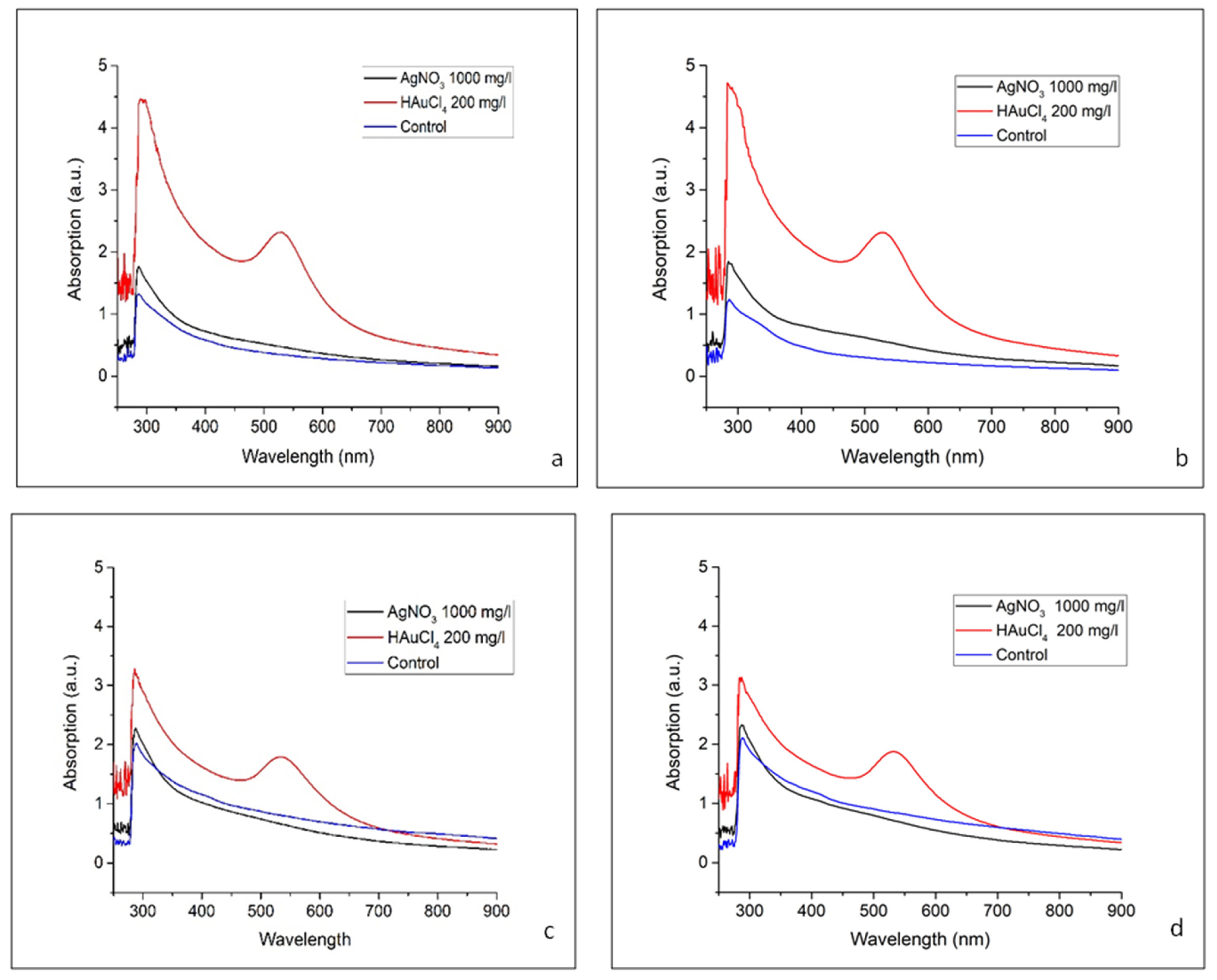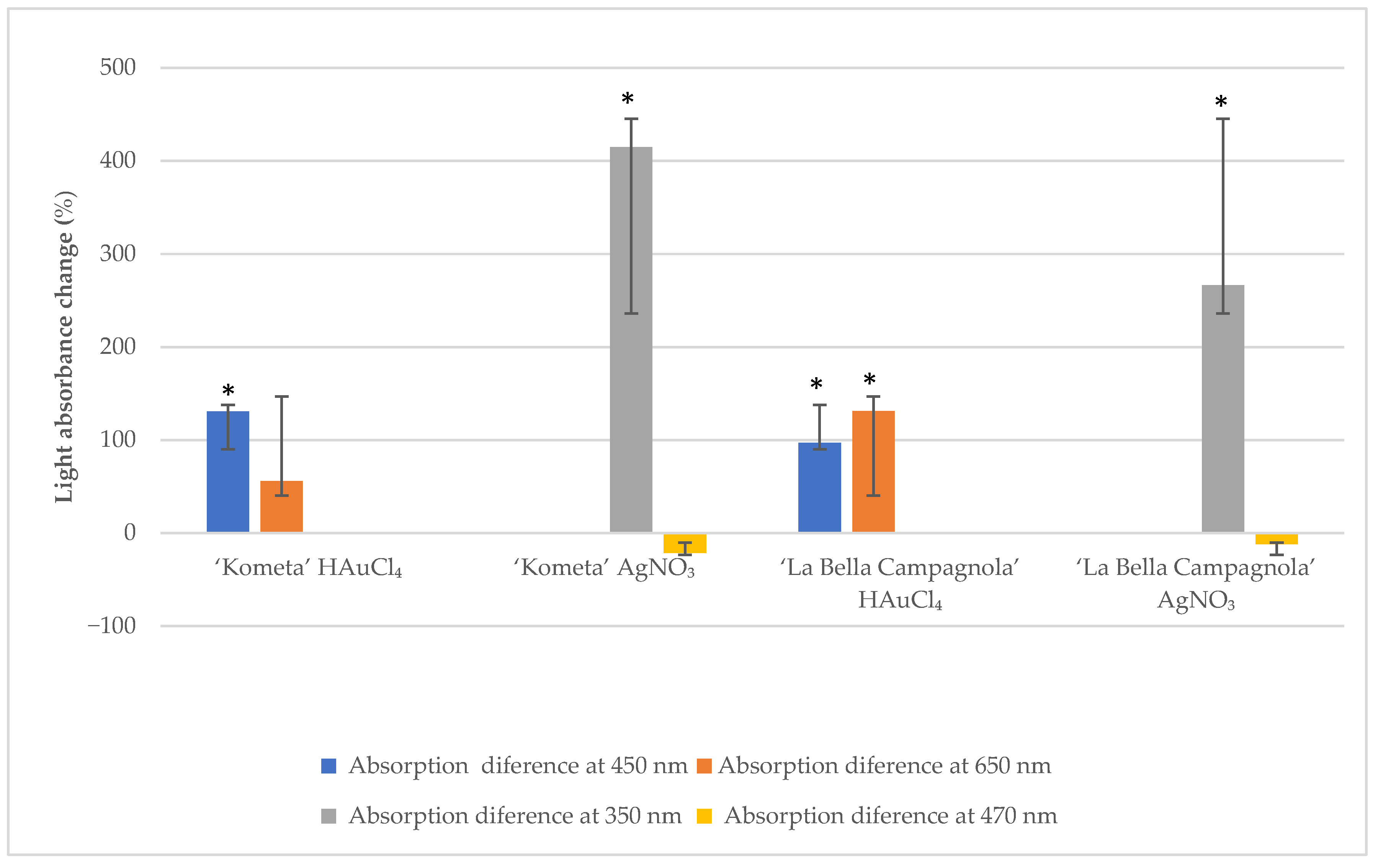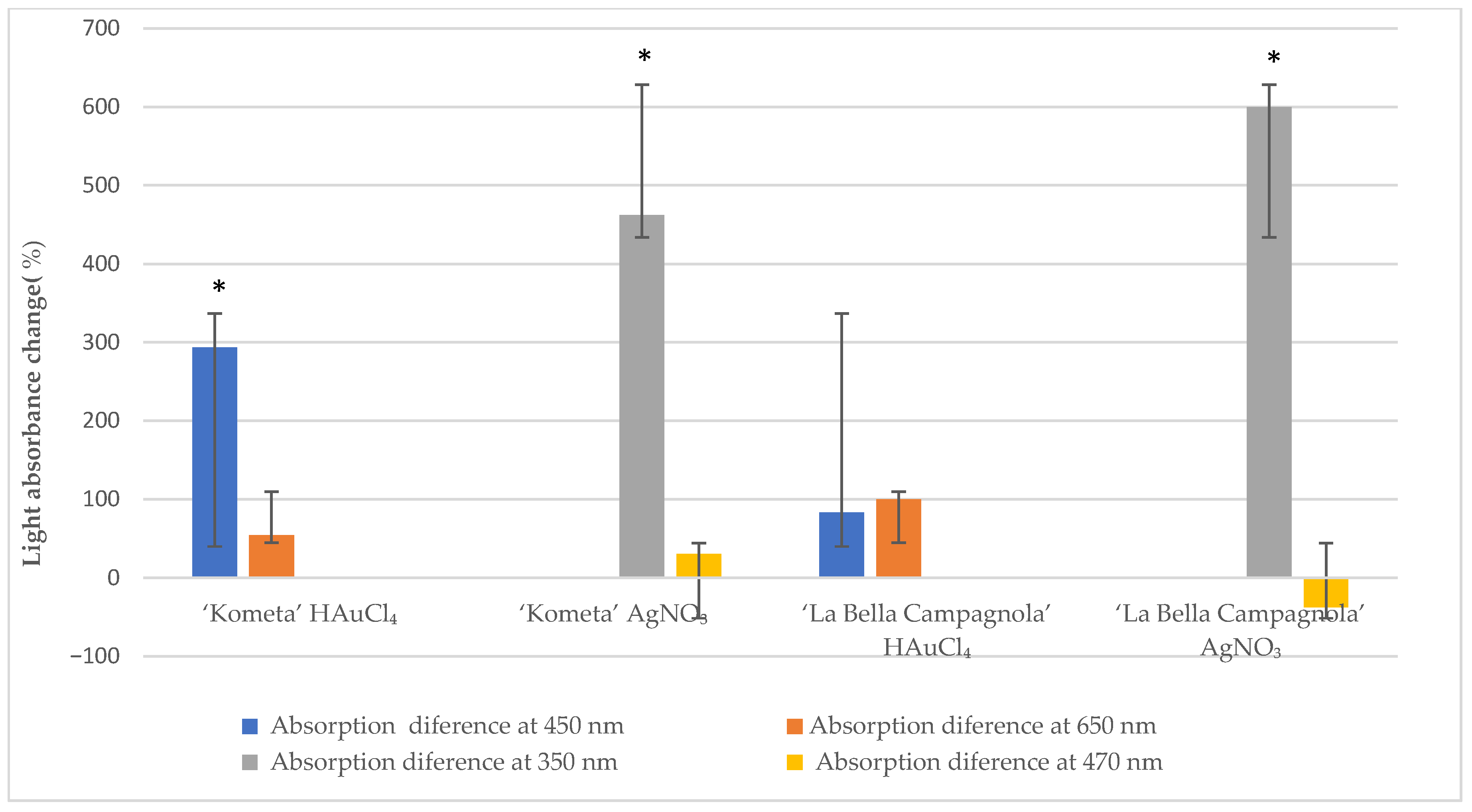 | Precursor and Exposure Time (h) | Precursor Concentration (mg/L) | Absorbance (a.u.) at 286 nm for ‘La Bella Campagnola’ | Absorbance (a.u.) Peak at 534 nm for ‘La Bella Campagnola’ | Absorbance (a.u.) at 286 nm for ‘Kometa’ | Absorbance (a.u.) at 534 nm for ‘Kometa’ |