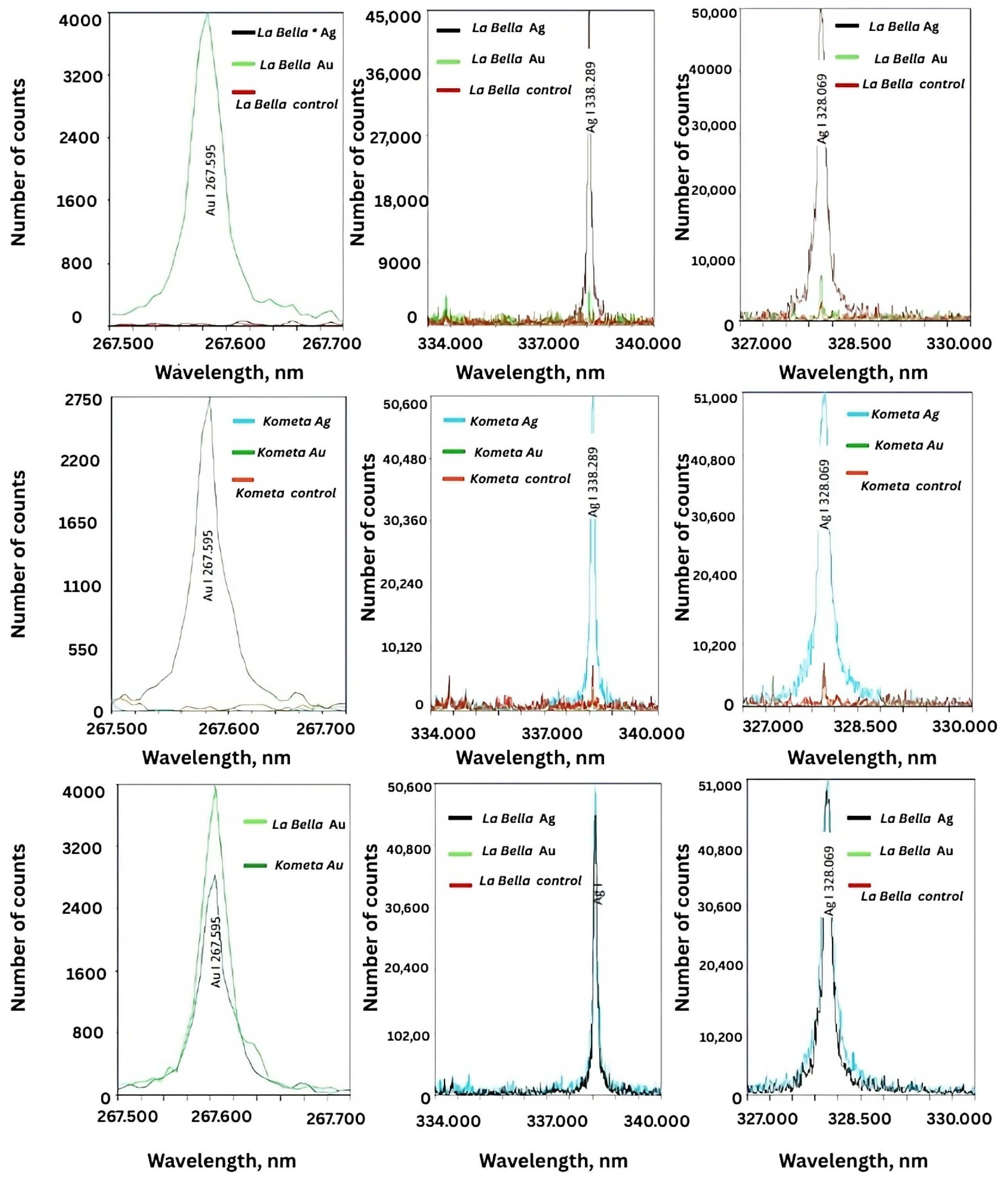 | Elemental Weight [%] | ‘Kometa’ Control | ‘Kometa’ HAuCl4 | ‘Kometa’ AgNO3 | ‘La Bella Campagnola’ Control | ‘La Bella Campagnola’ HAuCl4 | ‘La Bella Campagnola’ AgNO3 |