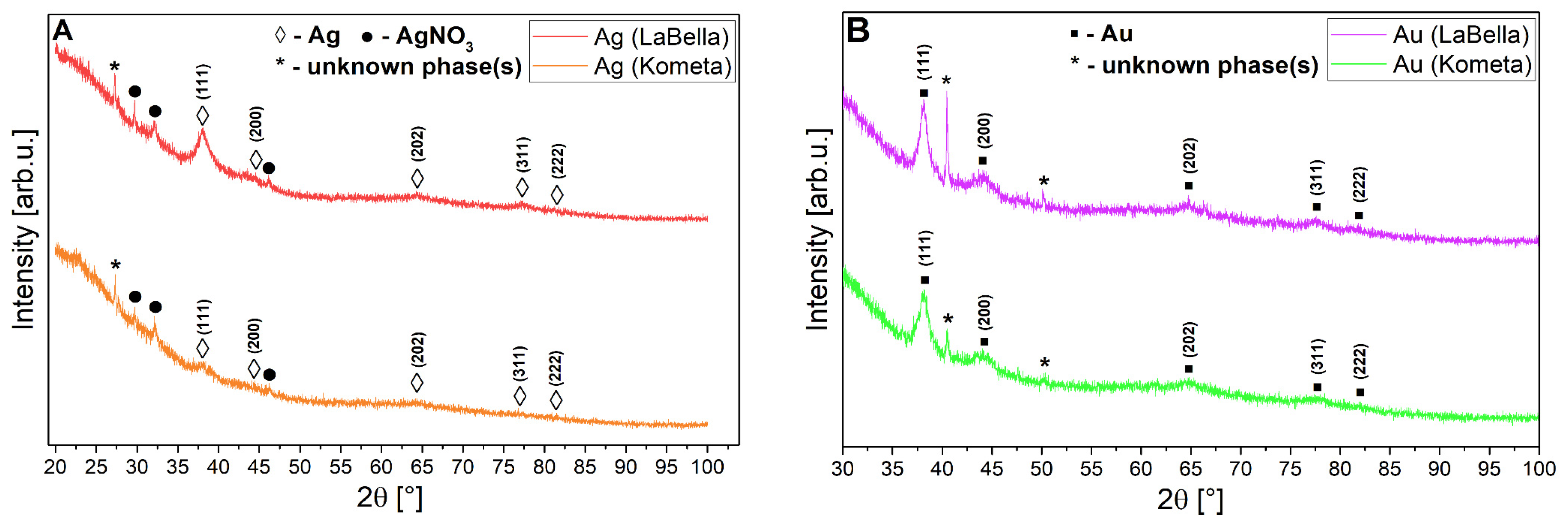 | ‘Kometa’ HAuCl4 | Au | 1074 ± 10 ↑ | 0.61 ± 0.05 ↑ * | −16 ± 1 ↓ * | 28 ± 18 |