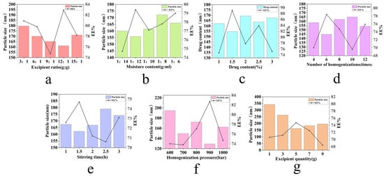 Single-factor investigation of SIN-LCNP formulation and process. (a) Effect of different excipient ratios on particle size and EE%. (b) Effect of different moisture contents on particle size and EE%. (c) Effect of different drug content on particle size and EE%. (d) Effect of different numbers of homogenizations on particle size and EE%. (e) Effect of stirring time on particle size and EE%. (f) Effect of homogenization pressure on particle size and EE%. (g) Effect of excipient quantity on particle size and EE%. Results are expressed as mean ± SD (n = 3).