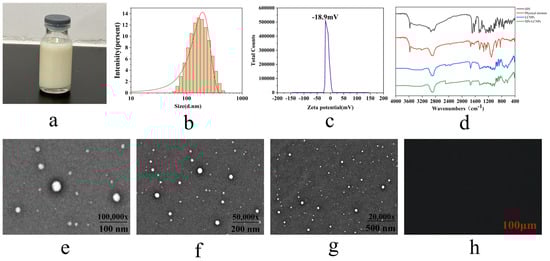 As shown in Figure 3e–g, the imaging results indicate that SIN-LCNPs possess a nearly spherical three-dimensional morphology with no evidence of aggregation or adhesion between particles. This stability can be attributed to electrostatic repulsion arising from abundant positive charges on the nanoparticle surfaces, which ensures stable dispersion []. During sample preparation using the phosphotungstic acid negative staining method, the concentration and amount of staining solution markedly affect particle contrast. Inappropriate droplet application or drying may result in localized particle aggregation. To minimize such artifacts, sample preparation conditions in this study were carefully controlled by diluting samples to suitable concentrations and ensuring uniform drying. These precautions effectively eliminated interference and ensured that the morphology observed in TEM images accurately reflected the true dispersed state of the nanoparticles.