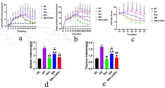 Pharmacodynamic study of SIN-LCNPs in AA rats. (a) Left paw thickness in each group. (b) Right paw thickness in each group. (c) Arthritis index scores in each group. (d) Spleen indices in each group, (e) Thymus indices in each group. (n = 6, * p < 0.05, ** p < 0.01, compared with the normal group; # p < 0.05, ## p < 0.01, comparing the Dex group, SIN group and SIN-LCNP group with the AA group; ▲ p < 0.05, ▲▲ p < 0.01, comparing the SIN and SIN-LCNP groups with the Dex group).