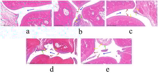 Pharmacodynamic study of SIN-LCNPs in AA rats: HE sections of joints from each group. (a) NC group; (b) AA group; (c) Dex group; (d) SIN group; (e) SIN-LCNP group. (n = 6, blue arrows indicate joint cavities; red arrows indicate cartilage surfaces; green arrows indicate synovial cells; yellow arrows indicate the degree of inflammatory cell infiltration in the tissue).