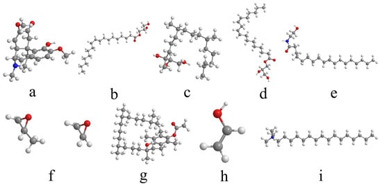 Three-dimensional molecular structure diagrams of excipient screening. (a) SIN; (b) GMO; (c) PT; (d) MGLA; (e) OEA; (f) P407; (g) VEA; (h) PVA; (i) CTAB. In all structures, gray represents carbon atoms, white represents hydrogen atoms, red represents oxygen atoms, and blue represents nitrogen atoms.