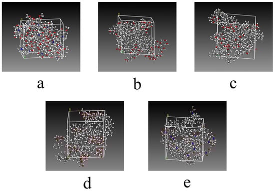 The optimized cell diagrams of excipient screening. (a) SIN; (b) GMO: The optimized unit cell structure of glycerol monooleate, showing carbon (gray), hydrogen (white), and oxygen (red) atoms forming typical ester and hydroxyl groups of the monoacylglycerol molecule, arranged in a stable configuration; (c) PT: The optimized unit cell structure of phytantriol, illustrating the branched alkyl chains (gray carbon and white hydrogen atoms) and trihydroxy functional groups (red oxygen atoms) that reflect the spatial conformation of this polyol excipient; (d) MGLA; (e) OEA. In all structures, gray represents carbon atoms, white represents hydrogen atoms, red represents oxygen atoms, and blue represents nitrogen atoms.