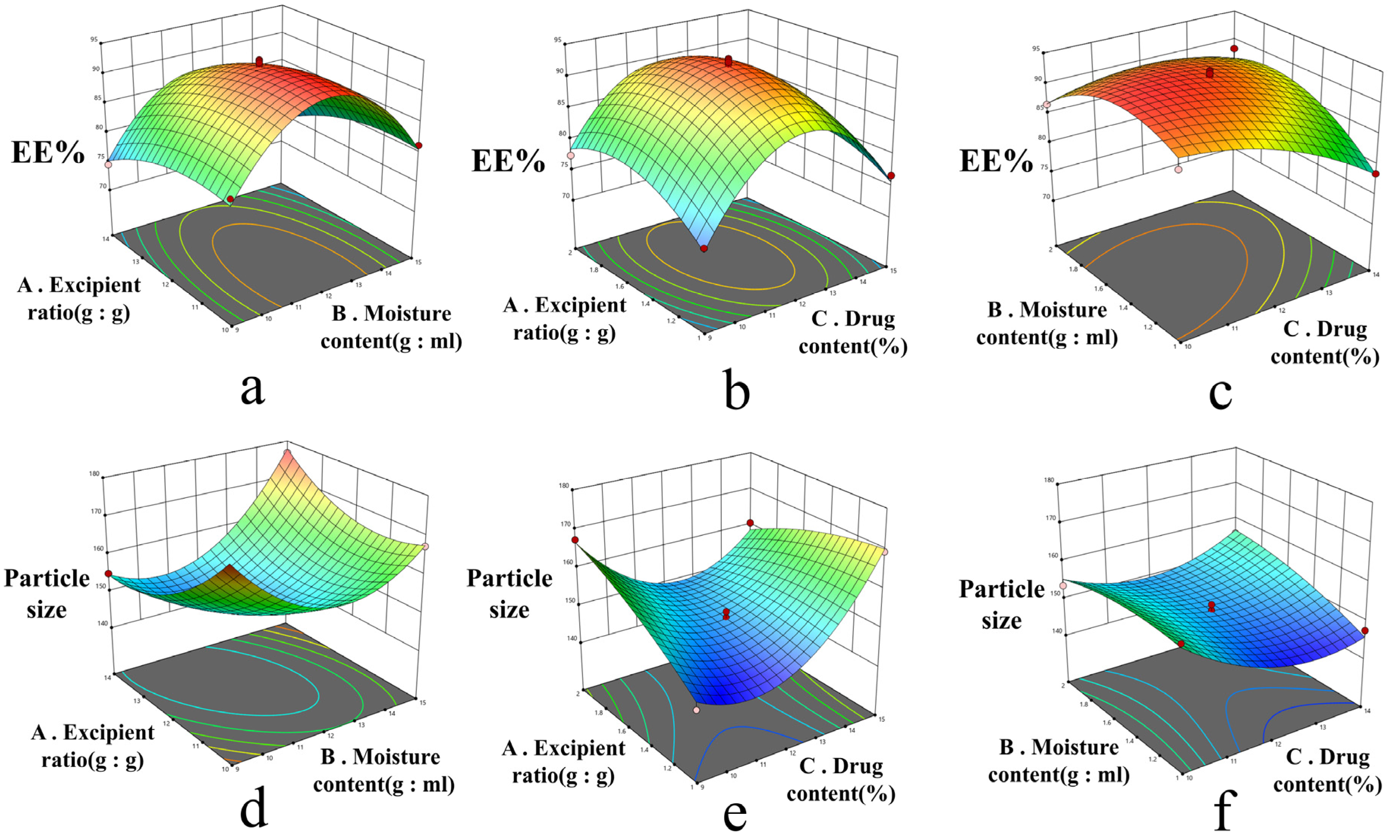 Initial screening of relevant variables was carried out through single-factor experiments. The formulation parameters examined included the excipient ratio, moisture content, drug content, and excipient quantity, while the processing variables comprised stirring time, homogenization pressure, and number of homogenizations. Based on the results of these preliminary tests, a systematic optimization was performed using the Box–Behnken response surface methodology to explore the interactions among the key formulation factors. Three variables—excipient ratio (A), moisture content (B), and drug content (C)—were selected for detailed investigation. A three-factor, three-level experimental design was developed, with the responses being EE% (Y1) and particle size (Y2). This approach aimed to identify the optimal combination of formulation parameters to maximize EE% and minimize particle size for enhanced nanocarrier performance.