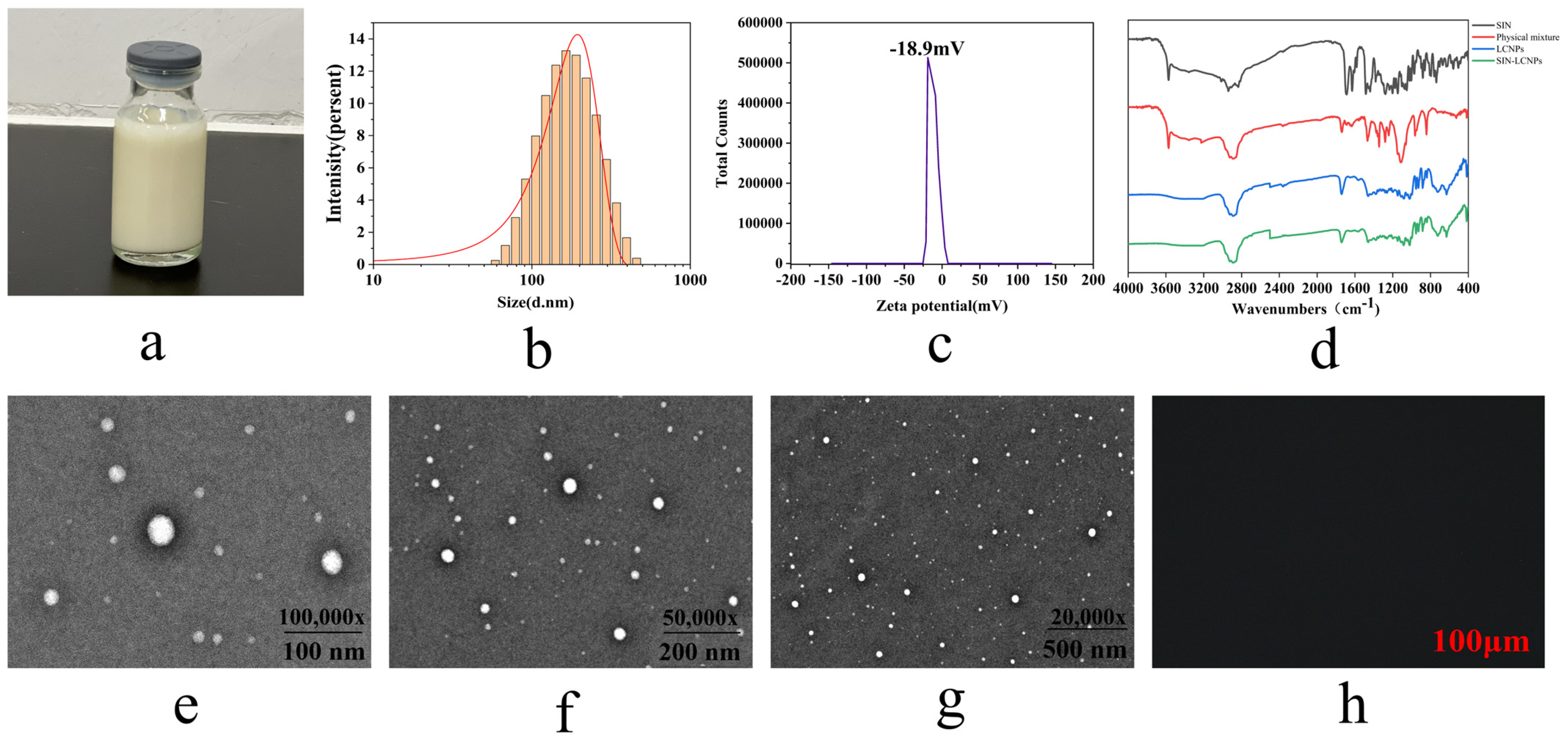 The particle size distribution of SIN-LCNPs was measured using a nanolaser particle size analyzer (Mastersizer 3000, Malvern Panalytical, Worcestershire, UK). The prepared SIN-LCNPs were stored in transparent vials at room temperature (RT, 20–25 °C) and equilibrated for 24 h prior to analysis. The morphological appearance was examined via macroscopic observation and recorded through photographs. An aliquot of the SIN-LCNPs was diluted 30-fold with ultrapure water to prepare the sample for particle size analysis. A 1 mL portion of the diluted sample was measured for particle size, PDI, and zeta potential using a nanoparticle size analyzer at room temperature. Each measurement was performed in triplicate to ensure reproducibility. The results are expressed as mean ± standard deviation.