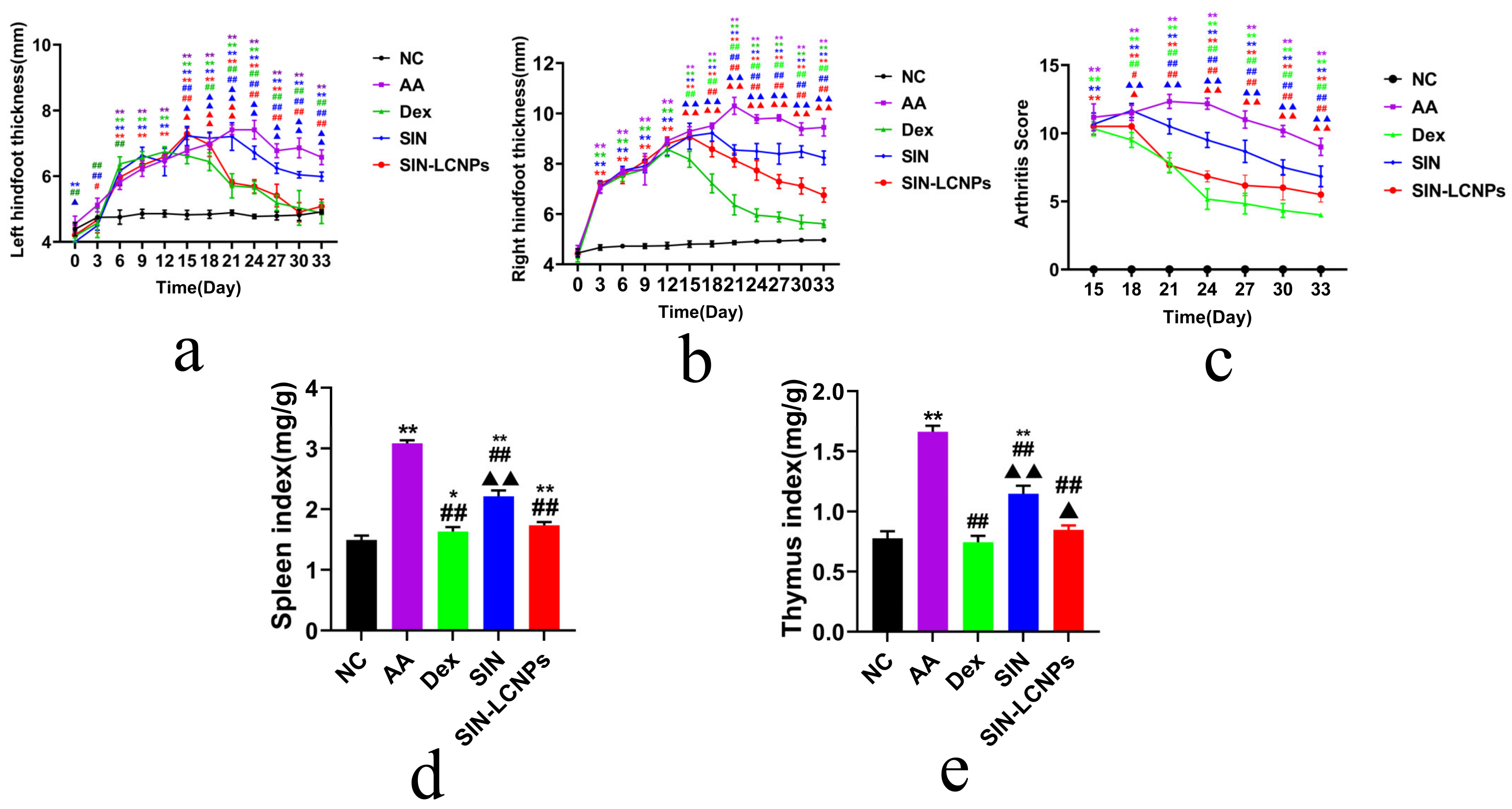n = 6 per group): AA model, Dex, SIN, and SIN-LCNPs. Treatments were initiated on Day 15, with all groups receiving oral gavage once daily for 21 consecutive days. The doses were calculated based on body surface area normalization, using 216 mg/day of SIN as the human equivalent dose, which corresponds to approximately 19.44 mg/kg/day in rats [