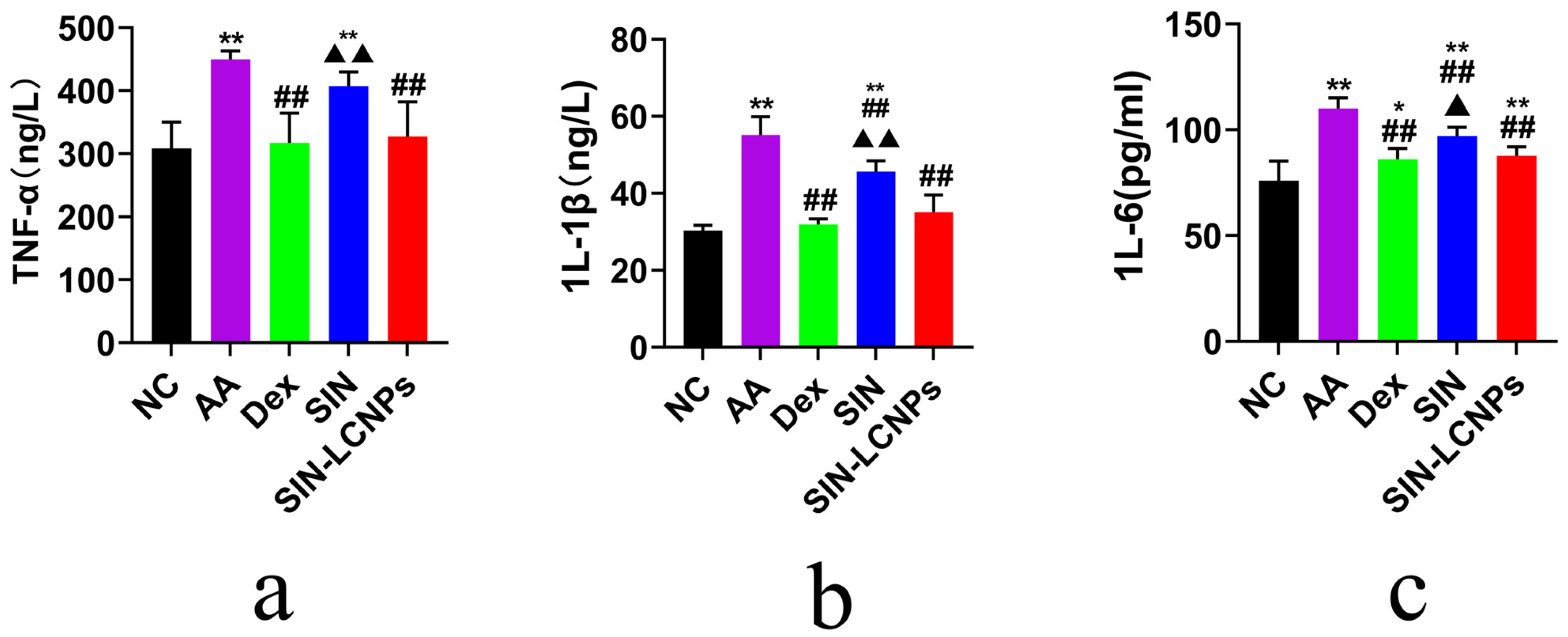 23]. In this study, SIN-LCNPs significantly reduced serum TNF-α, IL-1β, and IL-6 levels compared with SIN, suggesting that their therapeutic efficacy may be attributed, at least in part, to modulation of pro-inflammatory cytokine expression and suppression of the inflammatory response.