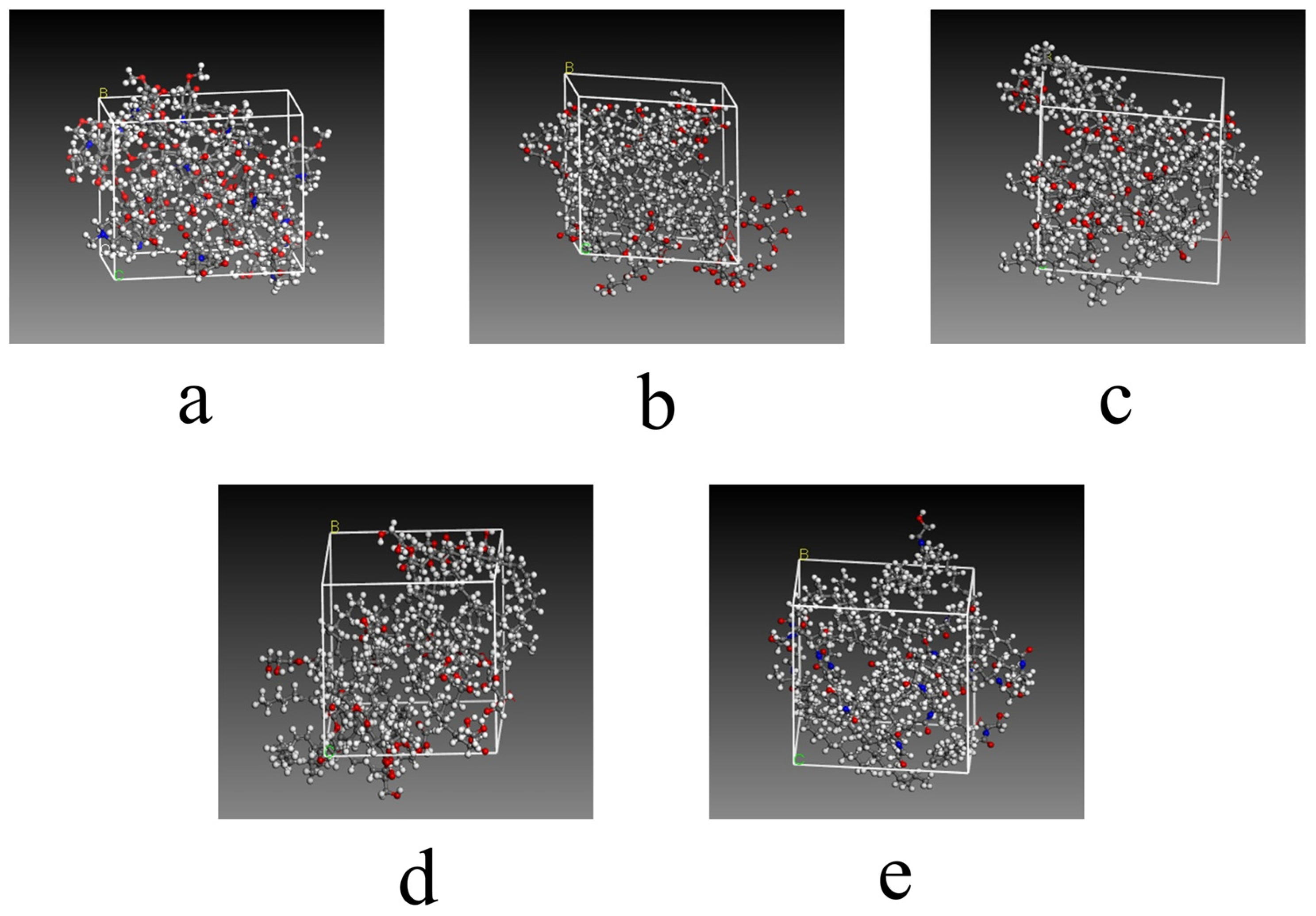 Figure 10. After four optimization cycles, the initially low-density, high-energy cells were transformed into stable, high-density unit cells. MD simulations were subsequently conducted in the NVT ensemble at 298 K using an Andersen thermostat, a 0.25 fs time step, and a total of 16,000 steps (4 ps simulation time). The COMPASS force field, charge assignments, and precision settings were consistent with previous stages. The non-bonded interaction cut-off was set to 12.5 Å, and long-range electrostatic interactions were computed using Ewald summation. As shown in