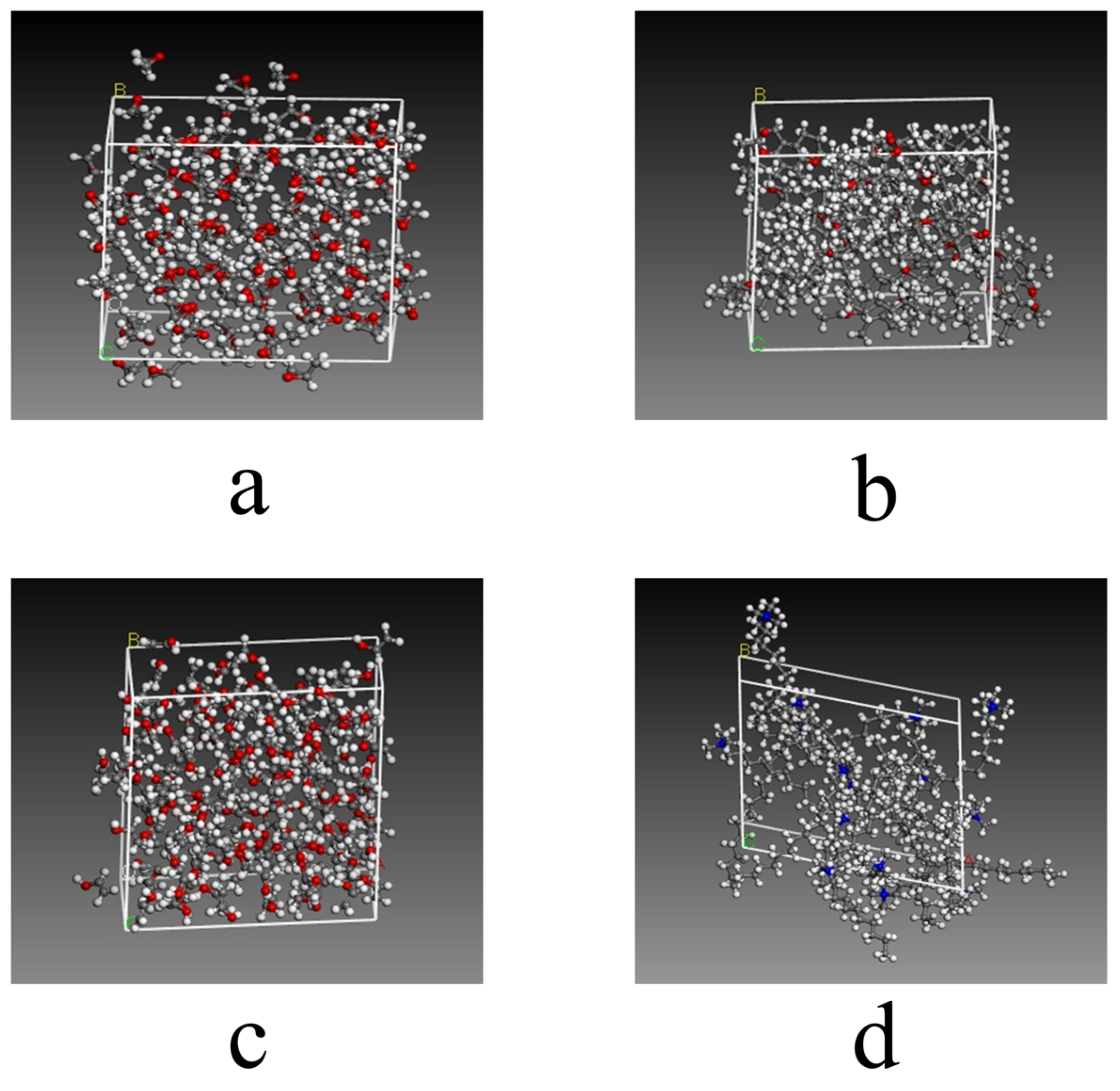 Figure 8. Bond lengths and angles were manually adjusted to generate reasonable initial conformations and avoid steric conflicts. Each molecular structure was then optimized using the Forcite module with the COMPASS force field. Atomic charges were assigned automatically by the module’s built-in charge equilibration algorithm under ultra-fine precision. A Smart optimization with an initial step size of 0.01 Å was first applied to rapidly remove large internal stresses and obtain preliminary conformations with appropriate bond lengths and angles. Subsequently, the Conjugate Gradient method was executed for 500 iterations to minimize potential energy to a local minimum, yielding optimized structures with stable energy values and RMS gradients <0.001 kcal·mol