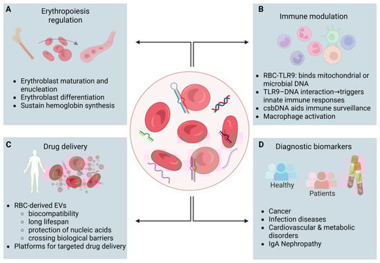 Residual genetic material in mature red blood cells (RBCs) and its potential roles. Although mature RBCs are anucleate, they retain residual RNA and DNA molecules that contribute to multiple biological and clinical functions. (A) Erythropoiesis regulation: Erythrocyte mRNAs and lncRNAs regulate erythroblast maturation, enucleation, and hemoglobin synthesis. (B) Immune modulation: RBC TLR9 binds mitochondrial or microbial DNA, triggering innate immune responses; csbDNA contributes to immune surveillance and macrophage activation. (C) Drug delivery: RBC-derived extracellular vesicles (EVs) show high biocompatibility, long lifespan, protection of nucleic acids, and capacity to cross biological barriers, making them natural platforms for targeted delivery. (D) Diagnostic biomarkers: Erythrocyte-derived RNAs serve as non-invasive biomarkers for a variety of diseases, including cancer, infectious diseases, cardiovascular and metabolic disorders, and IgA nephropathy. Created in BioRender. Fortis, S. (2025) https://BioRender.com/mku26dz (accessed on 29 October 2025).