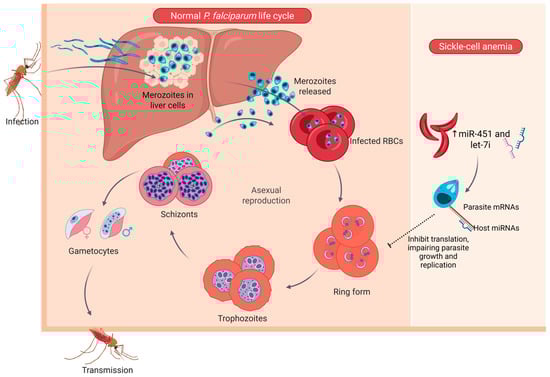 Schematic representation of the Plasmodium falciparum life cycle and inhibition by erythrocyte miRNAs in sickle-cell anemia. The left panel illustrates the normal asexual life cycle of P. falciparum, including infection of hepatocytes, release of merozoites, and intraerythrocytic development through the ring, trophozoite, and schizont stages, leading to gametocyte formation and mosquito transmission [32,33]. The right panel depicts the protective mechanism observed in sickle-cell (HbS) erythrocytes, where elevated levels of miR-451 and let-7i translocate into the parasite during the intraerythrocytic stage, bind to parasite mRNAs, and inhibit translation, thereby suppressing parasite growth and replication. Created in BioRender. Fortis, S. (2025) https://BioRender.com/mku26dz.