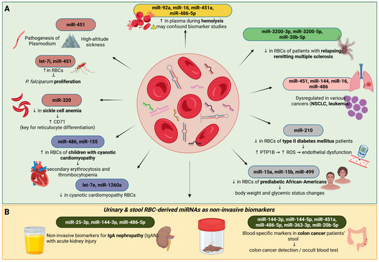 Pathological roles of erythrocyte-derived microRNAs (miRNAs). (A) Erythrocyte miRNAs are implicated in diverse pathological conditions and may serve as non-invasive biomarkers. In plasma, hemolysis elevates miR-92a, miR-16, miR-451a, and miR-486-5p, which may mislead interpretation; therefore, caution is required when assessing their value as biomarkers. Elevated levels of miR-451 and let-7i in red blood cells (RBCs) inhibit P. falciparum proliferation, while reduced miR-320 in sickle cell anemia leads to increased CD71 expression, affecting reticulocyte differentiation. Increased miR-486 and miR-155 have been observed in RBCs of children with cyanotic cardiomyopathy, associated with secondary erythrocytosis and thrombocytopenia. Conversely, let-7e and miR-1260a are reduced in cyanotic cardiomyopathy RBCs. Erythrocyte-derived miR-3200-3p, miR-3200-5p, and miR-30b-5p are reduced in relapsing-remitting multiple sclerosis. Dysregulation of erythrocyte-abundant miRNAs (miR-451, miR-144, miR-16, miR-486) has been linked to cancer, including NSCLC and leukemia. Reduced miR-15a, miR-15b, and miR-499 in prediabetic African Americans correlate with changes in body weight and glycemic status, while decreased miR-210 in type II diabetes mellitus increases PTP1B and ROS production, contributing to endothelial dysfunction. (B) Urine RBC-derived miR-25-3p, miR-144-3p, and miR-486-5p serve as non-invasive biomarkers for IgA nephropathy, while stool analysis of blood-specific miRNAs (miR-144-3p, miR-144-5p, miR-451a, miR-486-5p, miR-363-3p, miR-20b-5p) can detect blood/hemoglobin and may support colon cancer diagnostics. Created in BioRender. Fortis, S. (2025) https://BioRender.com/mku26dz.