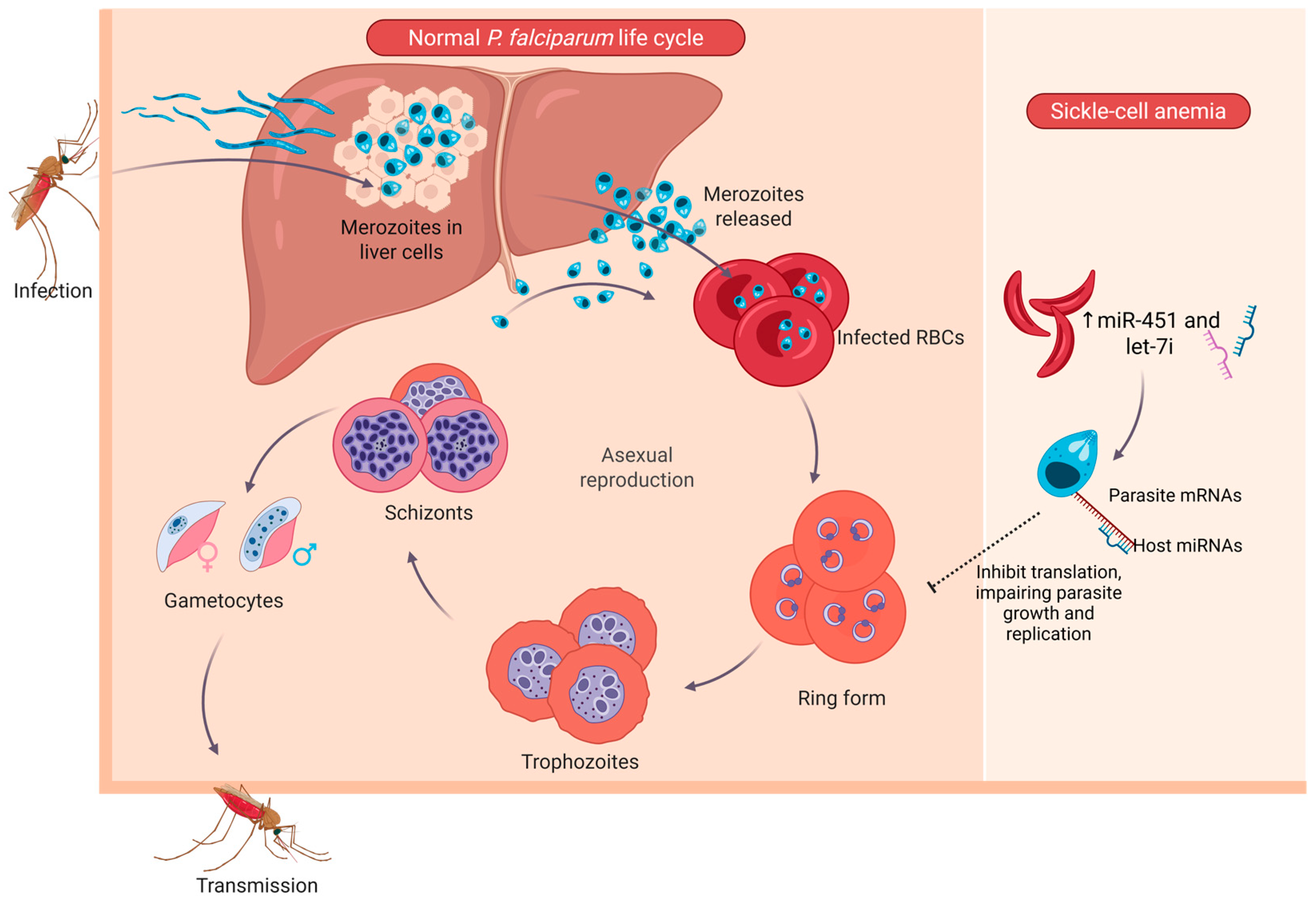 - LaMonte, G.; Philip, N.; Reardon, J.; Lacsina, J.R.; Majoros, W.; Chapman, L.; Thornburg, C.D.; Telen, M.J.; Ohler, U.; Nicchitta, C.V.; et al. Translocation of Sickle Cell Erythrocyte MicroRNAs into Plasmodium falciparum Inhibits Parasite Translation and Contributes to Malaria Resistance. Cell Host Microbe 2012, 12, 187–199. [Google Scholar] [CrossRef]