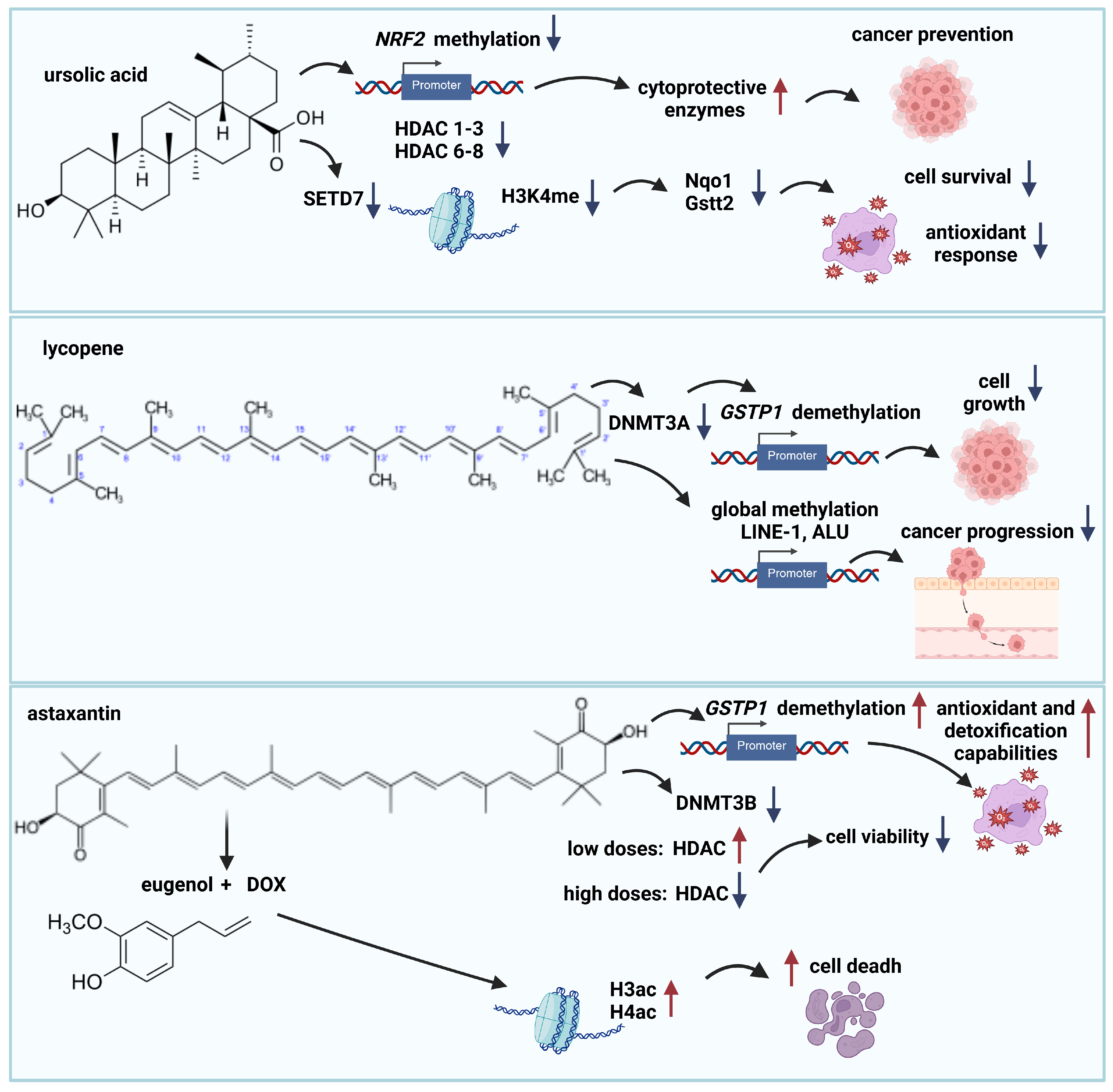 | GALLIC ACID | DNMT3B ↓ DNMT1 ↓ | CCNE2/3 ↑, CDKN1A ↑, CCNB1 ↑ | lung and oral cancer | growth ↓ |