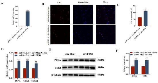 circFBN1 affects GC proliferation, apoptosis, and steroid synthesis and secretion. (A) Overexpression efficiency of circFBN1 in GCs. (B,C) EdU staining and positive EdU cell rate in GCs after circFBN1 overexpression. (D) Relative mRNA expression levels of key genes related to cell proliferation (PCNA, CDK1, and CCND1) in GCs after circFBN1 overexpression. (E,F) Relative protein expression levels of key genes related to cell proliferation (PCNA and CDK1) in GCs after circFBN1 overexpression. ** p < 0.01; *** p < 0.001.