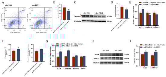 circFBN1 affects GC proliferation, apoptosis, and steroid synthesis and secretion. (A,B) Flow cytometry results of GCs after circFBN1 overexpression. (C,D) Relative protein expression levels of key genes related to cell apoptosis (Caspase-3) in GCs after circFBN1 overexpression (The areas marked with arrows are the target strips.). (E) The relative protein expression levels of key genes related to apoptosis in GCs after overexpression of circFBN1. (F) Concentrations of E2 and P4 in GCs after circFBN1 overexpression. (G) Relative mRNA expression levels of key genes related to steroid synthesis in GCs after circFBN1 overexpression. (H,I) Relative protein expression levels of key genes related to steroid synthesis (StAR and CYP11A1) in GCs after circFBN1 overexpression. * p < 0.05; ** p < 0.01.