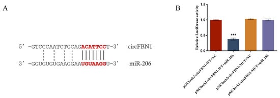 circFBN1 acted as a sponge of gga-miR-206: (A) Prediction of binding sites of circFBN1 and gga-miR-206; (B) Double luciferase report of gga-miR-206. *** p < 0.001.