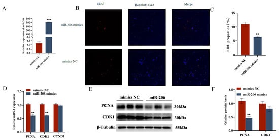 gga-miR-206 affects GC proliferation, apoptosis, and steroid synthesis and secretion: (A) Detection of transfection efficiency of miR-206 mimics; (B,C) Effect of gga-miR-206 on the proliferation of chicken GCs; (D) Expression levels of genes related to cell proliferation (CDK1, PCNA, CCND1); (E,F) Protein expression changes of CDK1 and PCNA after overexpression of gga-miR-206. ** p < 0.01; *** p < 0.001.