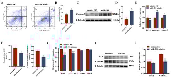 gga-miR-206 affects GC proliferation, apoptosis, and steroid synthesis and secretion: (A,B) Effect of gga-miR-206 on apoptosis of chicken GCs; (C,D) Protein expression changes of Caspase-3 after treatment with overexpression of gga-miR-206 (The areas marked with arrows are the target strips.); (E) Expression levels of genes related to cell proliferation (BCL-2, Caspase-3, Caspase-9); (F) ELISA was used to detect the effect of gga-miR-206 on the synthesis of estradiol and progesterone in chicken GCs; (G) Expression levels of genes related to steroid synthesis (StAR, CYP11A1, CYP19A1, FSHR); (H,I) Protein expression changes of StAR and CYP11A1 after overexpression of gga-miR-206. * p < 0.05; ** p < 0.01; *** p < 0.001.