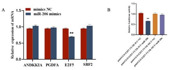 gga-miR-206 targets the E2F5 Gene: (A) Verification of target relationship between miR-206 and E2F5; (B) Validation of the targeting relationship between miR-206-3p and E2F5 3′UTR. ** p < 0.01.