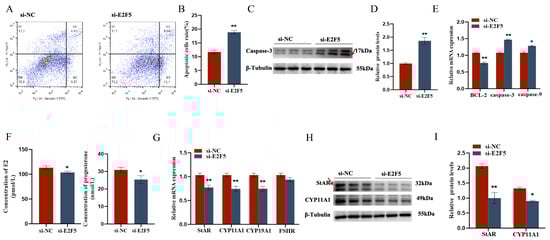 E2F5 affects GC proliferation, apoptosis, and steroid synthesis and secretion: (A,B) Effect of gga-miR-206 on apoptosis of GCs; (C,D) Change of Caspase-3 protein expression after interference E2F5 treatment (The areas marked with arrows are the target strips); (E) Expression levels of genes related to cell proliferation (BCL-2, Caspase-3, Caspase-9); (F) The effect of si-E2F5 on estradiol and progesterone synthesis in chicken GCs was determined by ELISA; (G) Expression levels of genes related to steroid synthesis (StAR, CYP11A1, CYP19A1, FSHR); (H,I) The protein expression of StAR, CYP11A1 changes after interfering with E2F5 (The areas marked with arrows are the target strips.). * p < 0.05; ** p < 0.01.