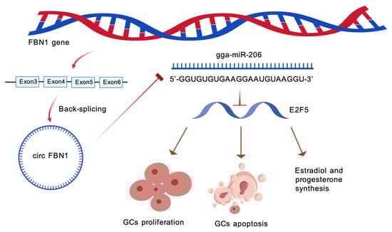 In summary, this experiment constructed a complete regulatory pathway: circFBN1 adsorbs miR-206, preventing its binding to E2F5 and maintaining the high expression level of E2F5. E2F5 further influences the proliferation, apoptosis and steroid hormone synthesis processes of granulosa cells by regulating the expression of cell cycle-related genes, apoptosis-related genes and steroid synthesis-related genes, ultimately providing support for the selection, growth and maturation of chicken follicles. The results of this study not only reveal the significant roles of circFBN1, ga-mir-206 and E2F5 in chicken follicular granulosa cells, but also clarify their interaction mechanisms (Figure 9). These results offer a new perspective on understanding the molecular regulatory network of follicular development in poultry and provide potential molecular targets for the genetic improvement of poultry reproductive performance.