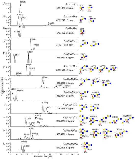 Extracted ion chromatograms of the [M+K]+ ions of HMOs from undigested sample 3, showing molecular formulas, exact masses, and possible structural assignments. The relative intensity is plotted against retention time. Measurements were performed in positive ionization mode using the Hypercarb column. (A) 2′FL (2′-fructosyllactose) and 3′FL (3′-fructosyllactose), (B) 3′SL (3′-sialyllactose) and 6′SL (6′-sialyllactose), (C) LDFT (lactodifructotetraose), (D) LNT F(lacto-N-tetraose), LNnT (lacto-N-neotetraose), (E) 3′S3FL (3′-sialyl-3-fucosyllactose), (F) LNFP I, II, III, and V (lacto-N-fucopentaose I, II, III, and V), (G) LSTa, b, and c (lacto-N-sialyltetraose a, b, and c), (H) LNDFH I and II (lacto-N-difucohexaose I and II), (I) LNH (lacto-N-hexaose), LNnH (lacto-N-neohexaose), (J) MFLNH I and III (monofucosyllacto-N-hexaose I and III), IFLNH I and III (isomerfucosyllacto-N-hexaose I and III), MFpLNH IV (monofucosyl-para-lacto-N-hexaose IV), (K) DFLNHa, b, and c (difucosyllacto-N-hexaose a, b, and c), DFpLNH II (difucosyl-para-lacto-N-hexaose II), (L) TFLNH (trifucosyllacto-N-hexaose). Referring to the Symbol Nomenclature for Glycans: yellow circle, galactose; blue circle, glucose; blue square, N-acetylglucosamine; red triangle, fucose; purple diamond, sialic acid.