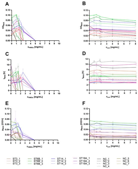 Growth parameters ODMAX (A,B), tMAX (C,D) and µMAX (E,F) extracted from the growth curves of different S. pneumoniae strains treated with HMOs (A,C,E) or equivalent lactose (B,D,F) concentrations. The strains are indicated in the legend. The experiments were performed in duplicate; the mean and range are shown in the graphs. In the legend, ST refers to the serotype, and NC indicates nonencapsulated (NESp isolates).
