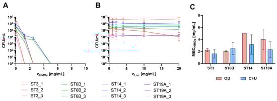 Quantification of CFU/mL following treatment with HMOs (A) or equivalent lactose concentrations (B). In Panel (A), the CFU/mL was set to 1 for the first concentration at which no growth was observed to indicate the killing concentration (as values below 0 cannot be represented on a logarithmic scale), and the concentration range shown extends to 10 mg/mL for visualization purposes. The legends for (A,B) are below the diagrams. (C) Minimal bactericidal concentration of the HMOs (MBCHMOs), assessed as the first nongrowth concentration on the basis of CFU or OD600 data of the vaccine serotypes.