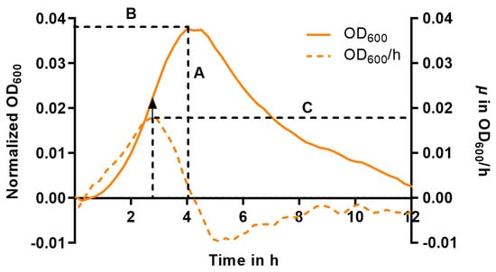 To describe the effect of the treatment, we determined the maximum of the curve (Figure 4, A), which is equivalent to the maximum achievable bacterial number (ODMAX), and the corresponding time to achieve this maximum (tMAX) (Figure 4, B). In cases where the curves exhibited a consistently decreasing trend from the beginning, ODMAX and tMAX were set to zero, as no growth occurred. Using the first derivative of the growth curve, we determined the inflection point of the logarithmic phase (maximum at the respective time) corresponding to the maximum growth rate µMAX [h−1] (Figure 4, C).