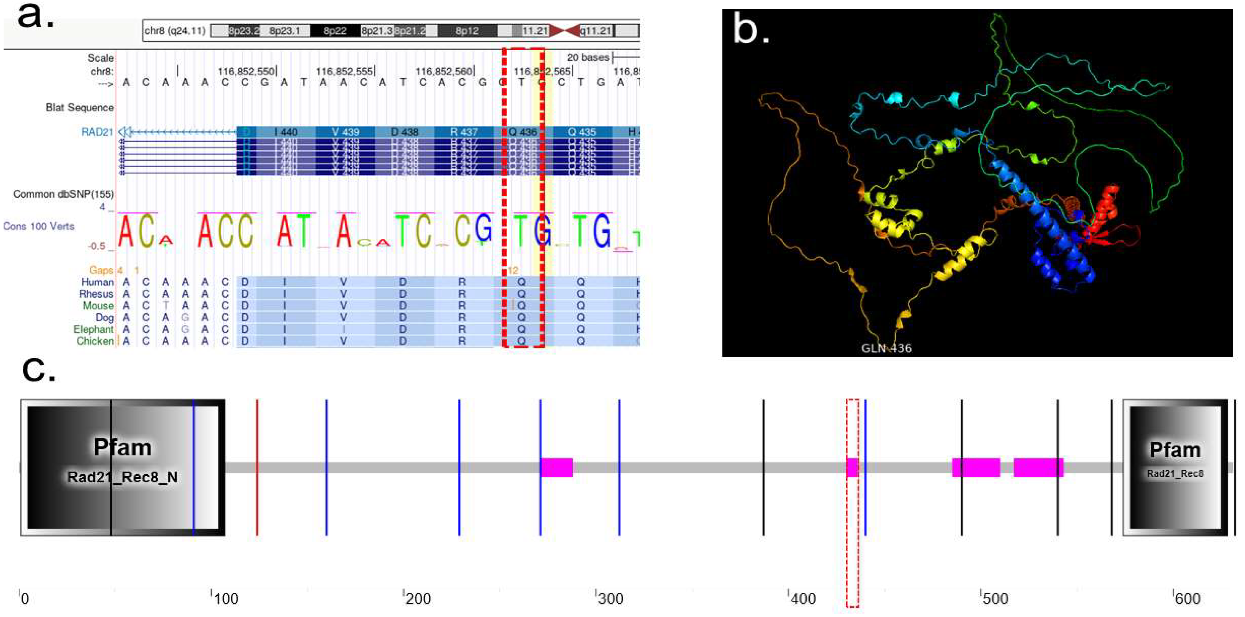 - National Center for Biotechnology Information ClinVar: NM_006265.3(RAD21):C.1306C>T (p.Gln436Ter). Available online: https://www.ncbi.nlm.nih.gov/clinvar/RCV001215062/ (accessed on 10 September 2025).