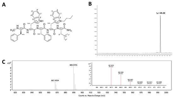 The butylated neuropeptide antagonist BU peptide was successfully synthesised via SPPS using standard t-Boc chemistry (Figure 1A). The peptide sequence, DMePhe-DTrp-Phe-DTrp(N-butyl)-Leu-NH2, incorporates an Nind-butyl modification at the D-Trp4 position, which is considered critical for enhanced cytotoxicity [11,12]. The crude peptide was purified using reverse-phase HPLC, yielding >95% purity with a retention time (tR) of 25.22 min (Figure 1B). Electrospray ionisation mass spectrometry (ESI-MS) confirmed the expected [M+H]+ molecular ion at m/z 867.49 and 889.4755 [M+Na]+ (Figure 1C), in agreement with the theoretical mass of BU peptide (866.49).